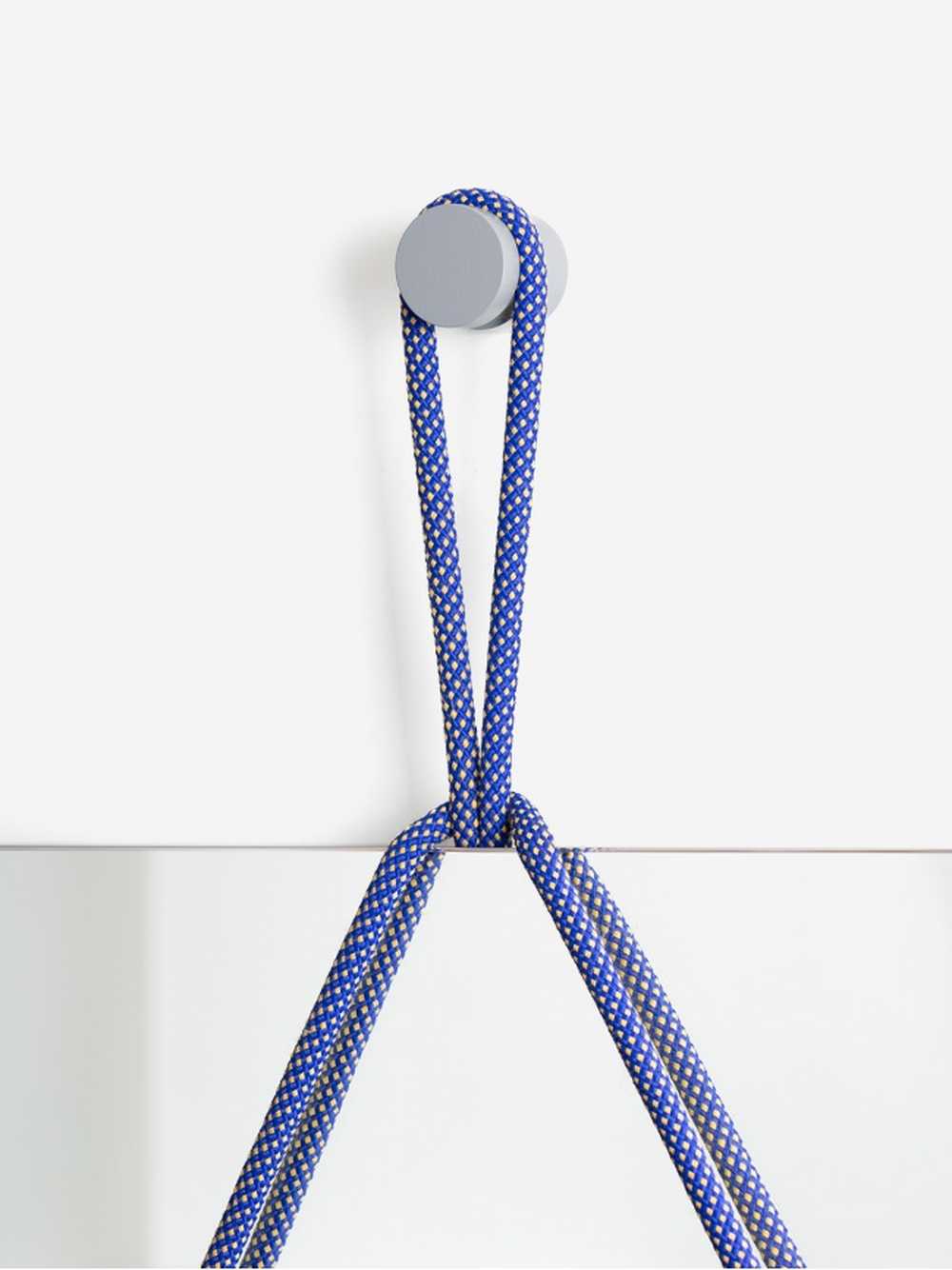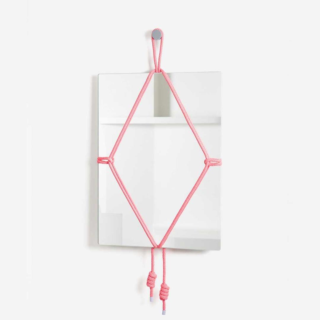 De plaatsing van de knopen zorgt samen met het gewicht van de spiegel voor een perfecte balans waardoor de spiegel op één punt kan worden opgehangen. De specifieke vlechting van het touw vangt dan weer de spanning van het gewicht van de spiegel op.