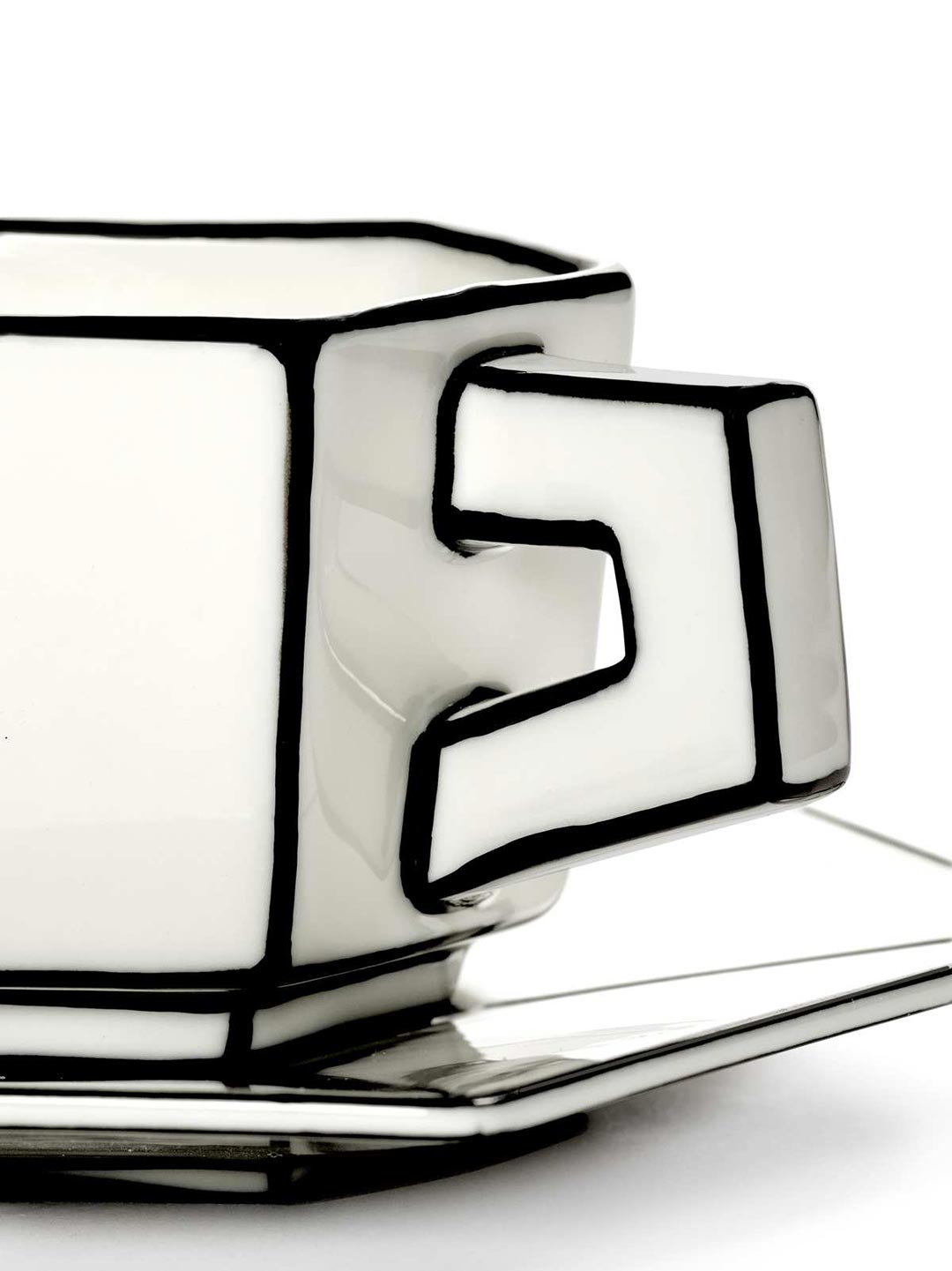 De Carte Blanche-collectie bestaat uit een reeks espressokopjes, cappuccinokoppen, theemokken met bijpassende schotels, een melkkannetje en een theepot. Elk stuk straalt een speelse eenvoud uit, alsof het rechtstreeks uit een schetsboek tot leven is gekomen. De naam Carte Blanche verwijst naar het onbeschreven blad – het witte karton – dat symbool staat voor de creatieve vrijheid en de eindeloze mogelijkheden van het ontwerpproces.