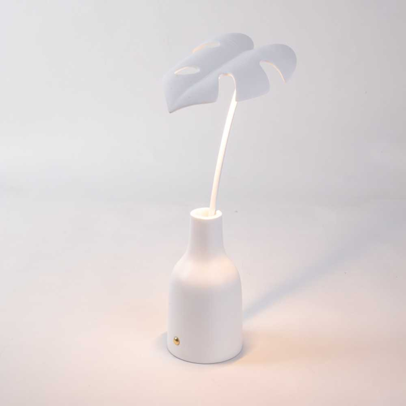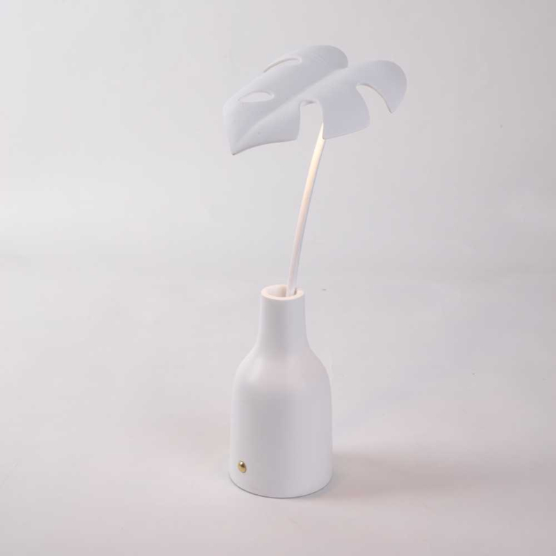 De oplaadbare tafellamp van het Italiaanse Seletti is gemaakt van resin (kunsthars) en heeft de vorm van een prachtige witte gatenplant met 1 blad. De lamp is Inclusief geintergreerd ledlampje van 3 watt. Dimbaar in 3 stappen...