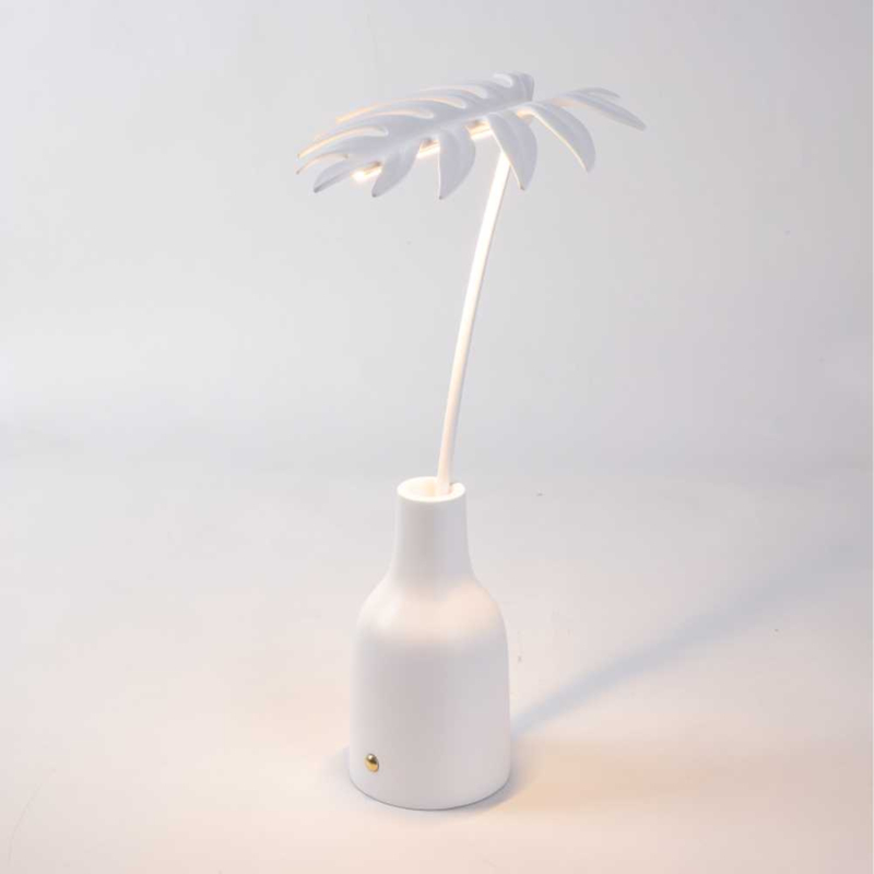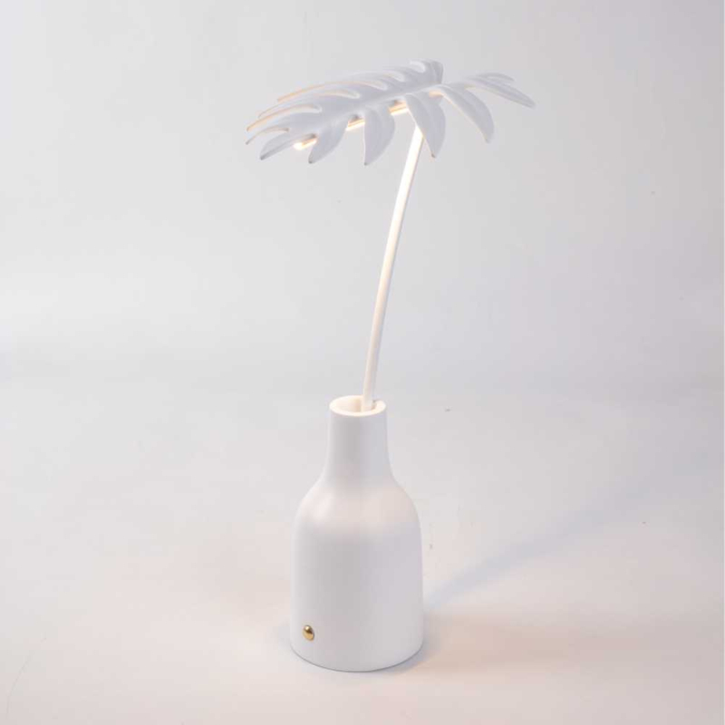 De oplaadbare tafellamp van het Italiaanse Seletti is gemaakt van resin (kunsthars) en heeft de vorm van een prachtige witte gatenplant met 1 blad. De lamp is Inclusief geintergreerd ledlampje van 3 watt. Dimbaar in 3 stappen...