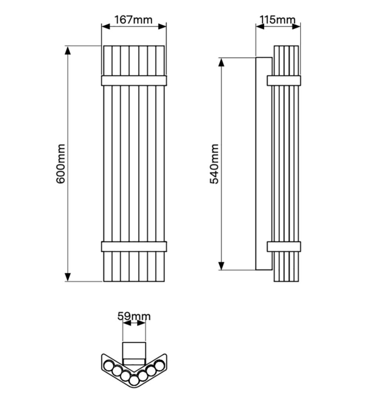 Lamp: lengte 60 cm, breedte 16,7 cm, hoogte 11,5 cm. Muur trafo: lengte 60 cm, diepte 5,9 cm, hoogte 5,9 cm.
