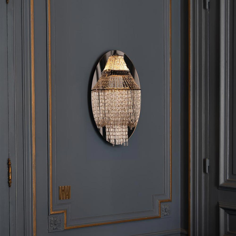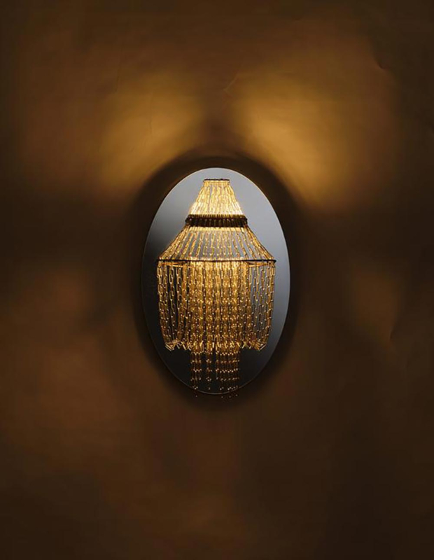 Zowel te krijgen als hanglamp of als wandlamp, beiden zeer indrukwekkend. De wandlamp is 38 cm breed, en 58 cm hoog, en niet zo diep (16,2 cm) wat verrassend is. Doordat de wandlamp tegen een rond espiegel is gemonteerd zie je in de muur een ronde kroonluchter...