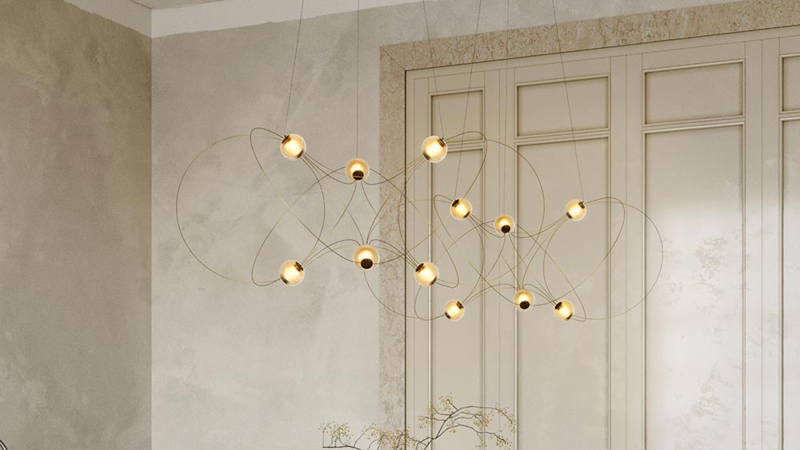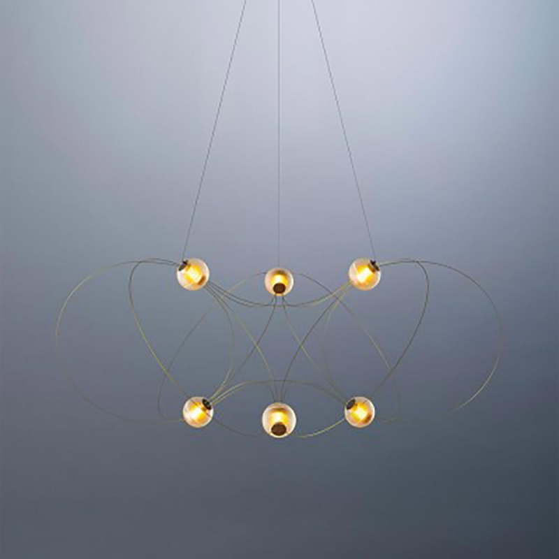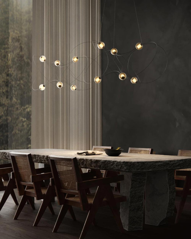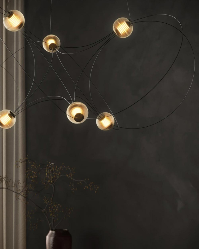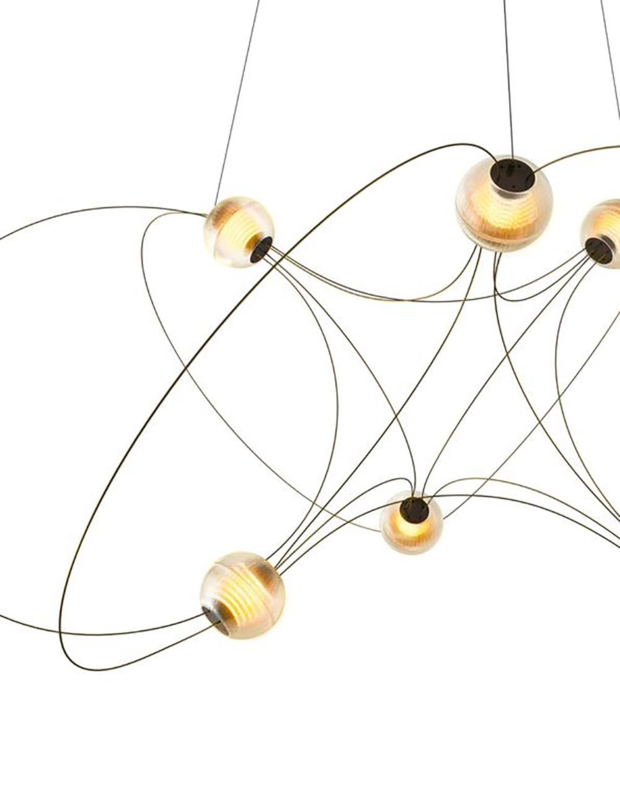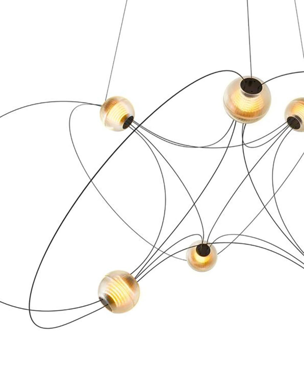 De Munari hanglamp van designer Lutz Pankow zijn als sterrenbeelden: lichtgevende objecten die grote indruk maken door de bijna wetenschappelijke schoonheid ervan. Ze zijn te krijgen in verschillende groottes: met 6, 8 of 10 'bollen' die in de lucht zweven, bij elkaar gehouden door elegante dunne cirkels.