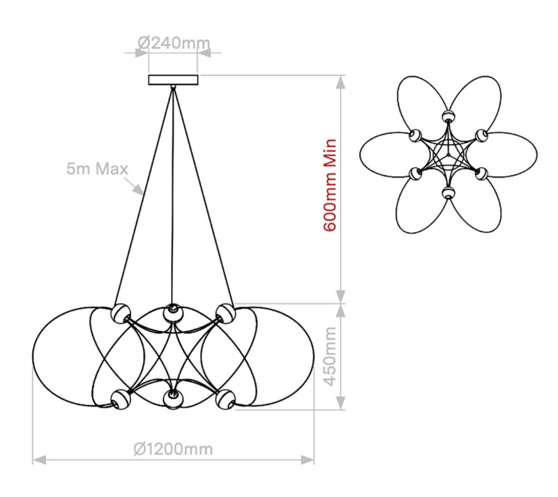 De Munari X6 hanglamp is de kleinste van de 3: het heeft een diameter van 120 cm en een hoogte van 45 cm. De bollen (diemater 8,4 cm) van de Munari bevatten dimbare geïntegreerd LED die per stuk 640 lumen zijn en warm van licht (2400K). De X6 heeft hierdoor een totaal van 3840 lumen. De ophangsnoeren kunnen wel tot 5 meter lang zijn dus deze 'kroonluchters' zijn geschikt voor hoge ruimtes.