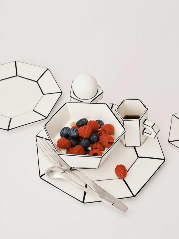 De Carte Blanche-collectie bestaat uit een reeks espressokopjes, cappuccinokoppen, theemokken met bijpassende schotels, een melkkannetje en een theepot. Elk stuk straalt een speelse eenvoud uit, alsof het rechtstreeks uit een schetsboek tot leven is gekomen. De naam Carte Blanche verwijst naar het onbeschreven blad – het witte karton – dat symbool staat voor de creatieve vrijheid en de eindeloze mogelijkheden van het ontwerpproces.