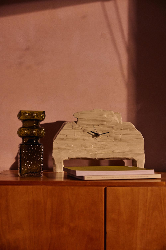 Deze klok van Teun Zwets voor het Nederlandse designmerk HKLIVING is een eigentijdse interpretatie van de traditionele schoorsteenmantelklassieker en heeft de prachtige karakteristieke uitstraling dat al zijn werk kenmerkt: ongefilterd, met felle kleuren en in hoogglans, gemaakt van ruwe materialen die eruitzien alsof ze rechtsreeks uit zijn werkplaats komen. Ze zijn als personages die in je interieur absoluut zullen opvallen.