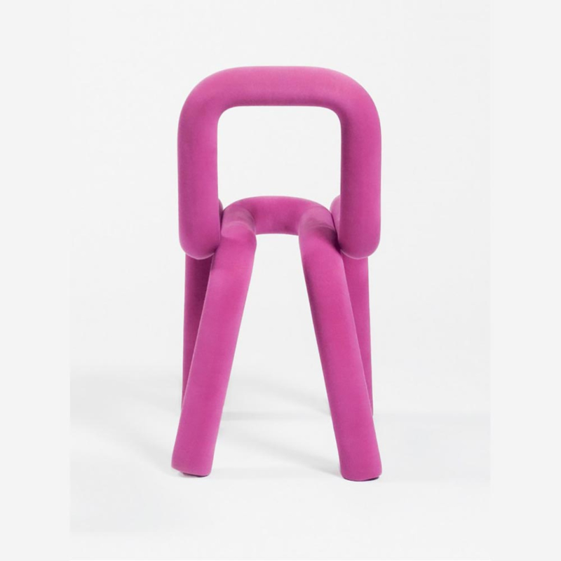 De Bold Chair bestaande uit twee buisvormige delen van metaal die in elkaar vallen, is een vernieuwde versie van de traditionele stoel gemaakt van gebogen stalen buizen. Zacht gemaakt met een laag polyurethaanschuim zit je direct op de dikke buisvorm. De stoel heeft zo geen aparte zitting of rugleuning: de buizen zijn de zitting en rugleuning. Rond het schuim zit een verwijderbare textielomhulsel, die je in de meest sprankelijke kleuren kunt krijgen.