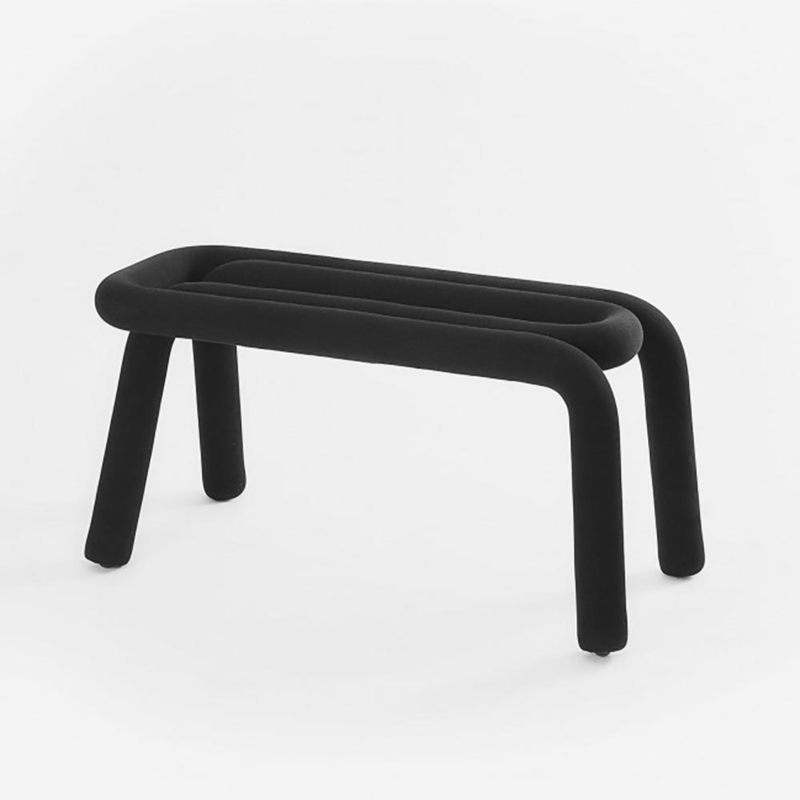 De Bold Bench bestaande uit twee buisvormige delen van metaal die in elkaar vallen, is een vernieuwde versie van de traditionele stoel gemaakt van gebogen stalen buizen. Zacht gemaakt met een laag polyurethaanschuim zit je direct op de dikke buisvorm. Het bankje heeft zo geen aparte zitting: de buizen zijn de zitting. Rond het schuim zit een verwijderbare textielomhulsel, die je in de meest sprankelijke kleuren kunt krijgen.