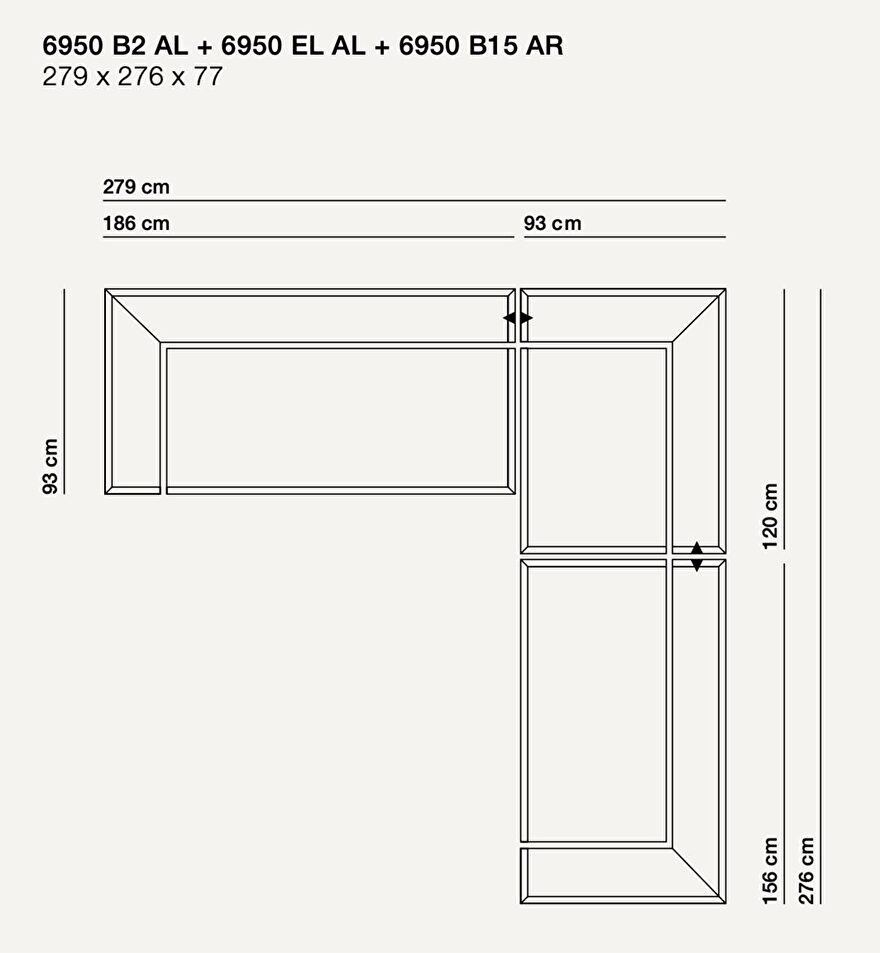 De 6950 hoekbank van 279 bij 276 cm bestaat uit drie delen: een deel van 186 cm, de 6950 B2, een hoekdeel van 120 x 93 cm, de 6950 EL en deel van 156 cm, de 6950 B15. Zie afbeelding hieronder. Dit kan uiteraard ook gespiegeld gekregen worden.