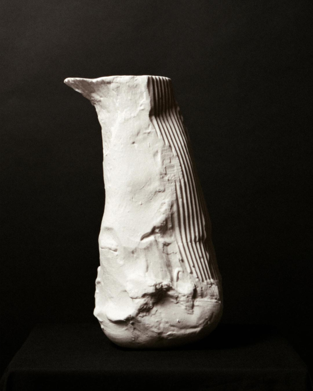 De serie bestaat uit twee vazen, drie karaffen en een beker, gemaakt van porselein. Elk stuk is een harmonieuze mix van oude invloeden en modern design, gemaakt via een intuïtief en handmatig proces dat imperfecties omarmt. Het resultaat zijn objecten die de verweerde elegantie van tijdloze sculpturen oproepen en hen verbinden met de schoonheid van het huidige moment.