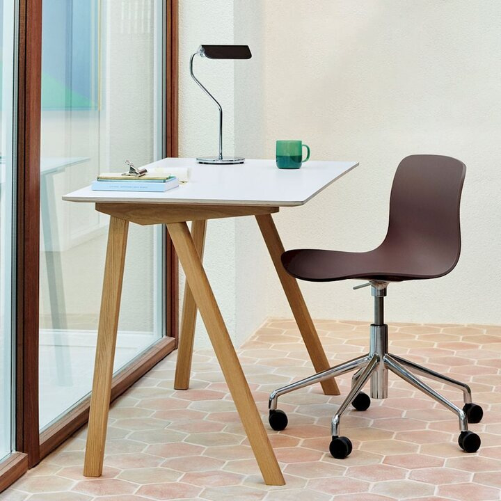 De Apex Tafellamp combineert klassieke elementen van de Banker's Lamp met zijn eigentijdse en kleurrijke stijl. De gevouwen stalen lampenkappen creëren een silhouet met een spitse daklijn. De ronde voet en de schuine arm worden aangevuld met een kleurrijke lampenkap die 360 graden kan draaien, waardoor gebruikers het licht naar wens kunnen richten. De Apex Tafellamp biedt een functionele verlichtingsoplossing voor verschillende ruimtes en toepassingen, van bureaulamp tot leeslampje naast het bed.