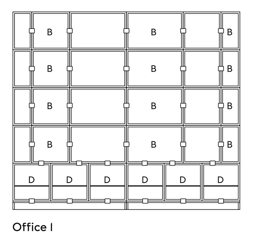 Er zijn van de office kast 5 verschillende configuraties samengesteld. De grootste is 262 cm breed en 228 cm hoog, de kleinste 87 cm breed en 75 cm hoog. De B staat voor achterwand, de D voor module met deur.