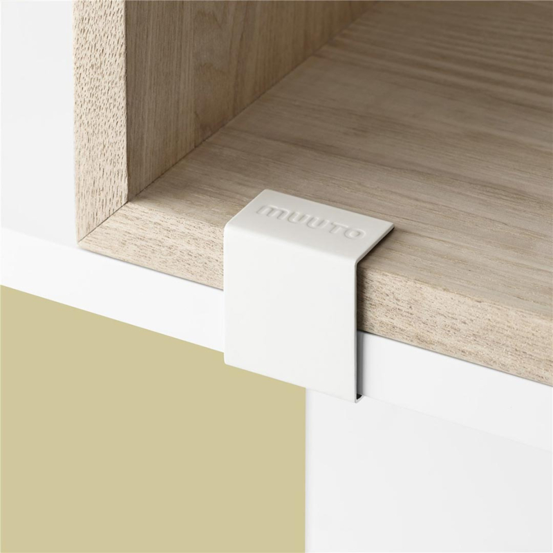Elke module wordt geleverd met twee clips in dezelfde kleur als de module (een eiken module wordt geleverd met twee clips in het grijs). Kijk of er, afhankelijk van je gewenste kast, extra clips nodig zijn om de modules vast te zetten. Bij het samenvoegen van modules, podia en bovenplaten moeten altijd clips worden gebruikt. De clips moeten ook tussen modules links en rechts geplaatst worden om de algehele stabiliteit van de Stacked te verbeteren.
