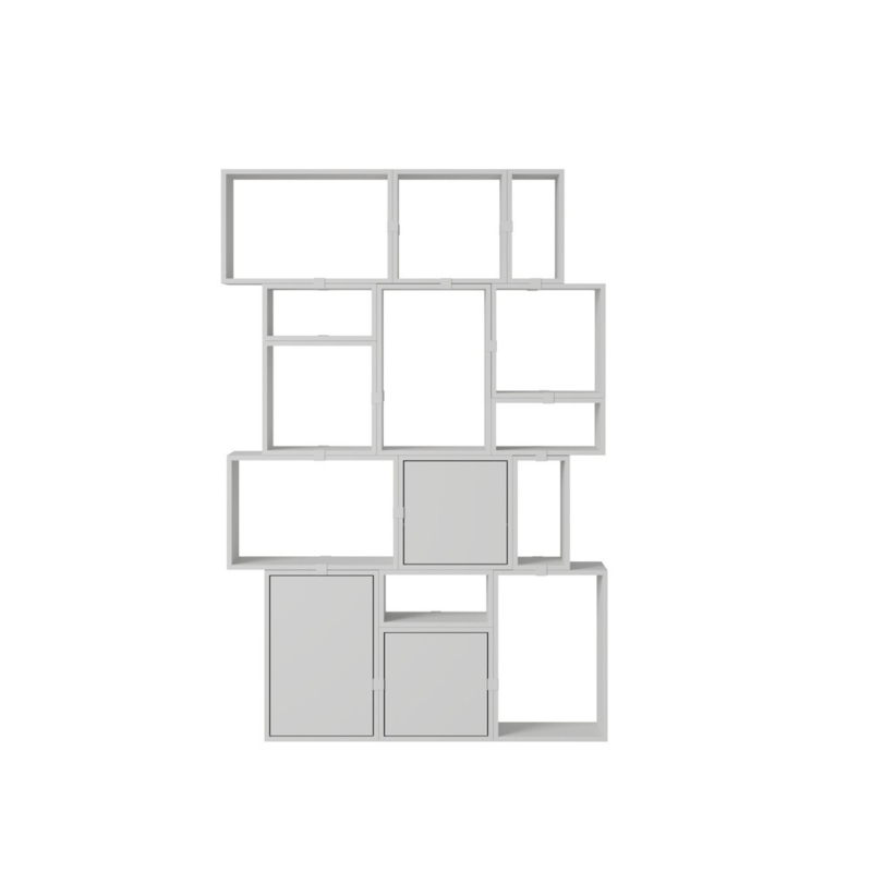 Het modulaire kastsysteem Stacked Storage System van designer Julien De Smedt voor Muuto is buitengewoon eenvoudig maar tegelijkertijd extreem veelzijdig. Er zijn 3 type modules die door hun verhoudingen gemakkelijk kunnen worden gecombineerd: er is een kleine smalle module van 21,6 x 43,8 cm, een vierkante module van 43,8 x 43,8 cm en een grote module van 43,8 x 65,4 cm, allen uitgevoerd in dezelfde diepte, namelijk 35 cm. Deze zijn met of zonder achterwand, met of zonder deur, en in vier verschillende kleuren te combineren: wit, grijs, bruin-groen of eiken.