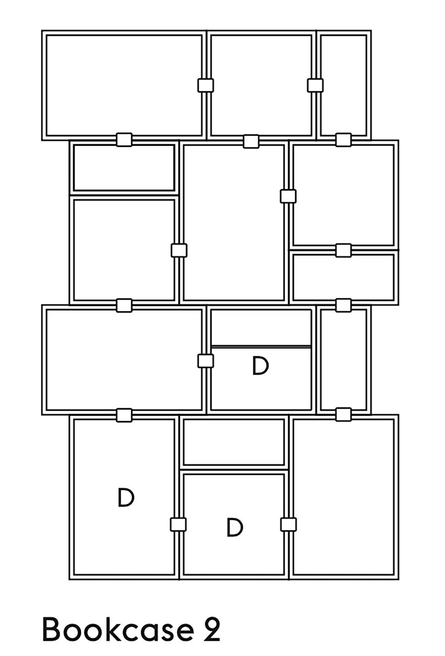 Er zijn van de boekenkasten 8 verschillende configuraties samengesteld. De grootste is 262 cm breed en 228 cm hoog, de kleinste 65 cm breed en 218 cm hoog. De B staat voor achterwand, de D voor module met deur.