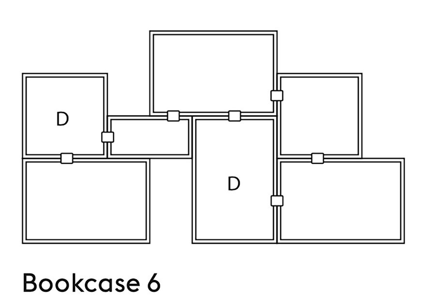 Er zijn van de boekenkasten 8 verschillende configuraties samengesteld. De grootste is 262 cm breed en 228 cm hoog, de kleinste 65 cm breed en 218 cm hoog. De B staat voor achterwand, de D voor module met deur.