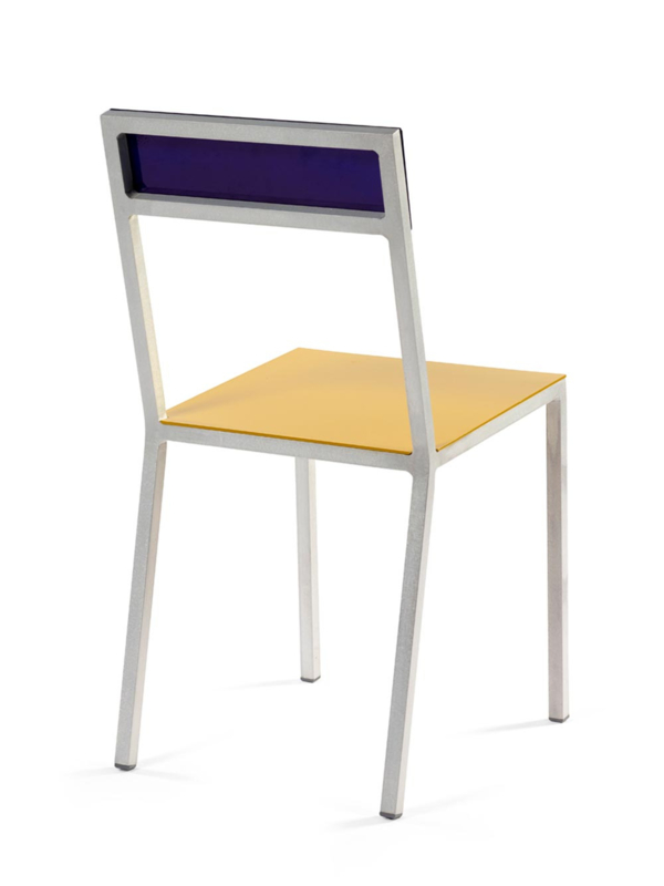 Het aluminium frame van de stoel is fris glimmend want aluminium, terwijl de gekleurde rugleuning en zitting hem die typische Muller Van Severen esthetiek geven.