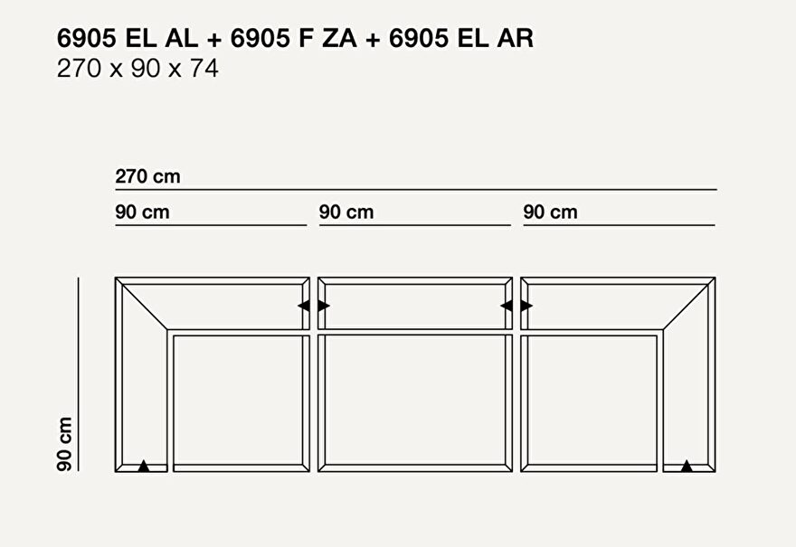 De 6905 3-zitsbank van 270 cm bestaat uit drie delen, de 6905 EL AL, 6905 F ZA en de 6905 EL AR, van ieder 90 cm. Zie afbeeling hieronder.