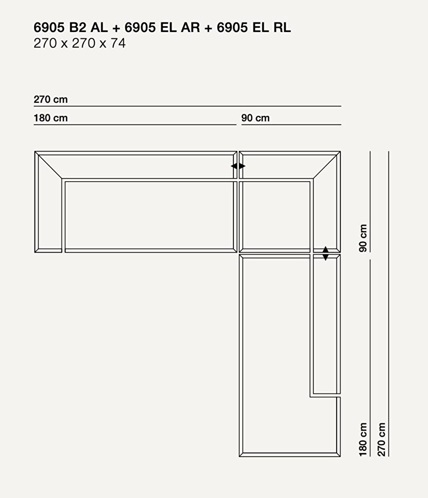 De 6905 hoekbank van 270 x 270 cm bestaat uit drie delen, de 6905 B2 AL, de 6905 EL AR en de 6905 EL RL. Zie afbeelding hieronder.