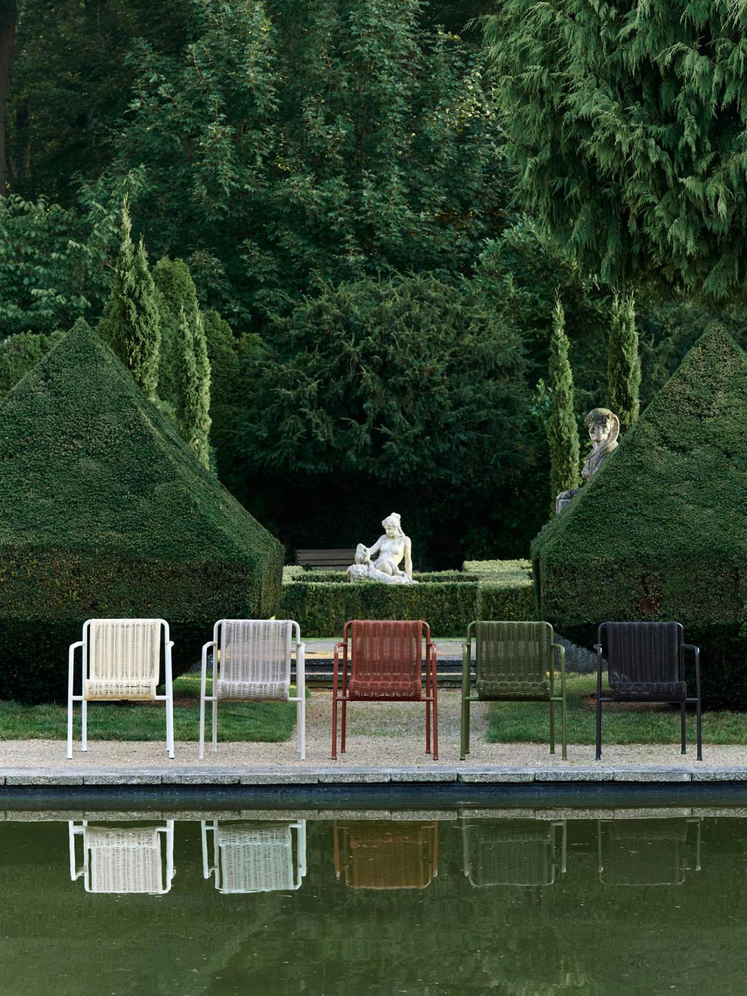 Het Palissade Cord tuinmeubilair van ontwerpers Ronan en Erwan Bouroullec voor designmerk HAY is een uitgebreide serie, inmiddels te krijgen in vrij veel kleuren. Wat opvalt aan de Palissade reeks is dat ze elegant en rank ogen maar bij nader inzien zeer sterk en robuust zijn. Wij waren echt positief verrast toen we ze in het echt zagen en erop plaats namen: ze zijn niet alleen mooi maar zitten ook zeer comfortabel. Het cord word met de hand gespannen en bestaat 100% uit gerecycled polyester.