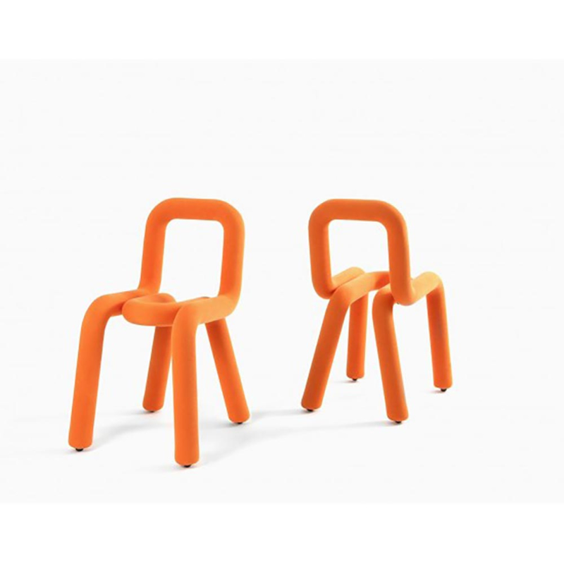 De Bold Chair bestaande uit twee buisvormige delen van metaal die in elkaar vallen, is een vernieuwde versie van de traditionele stoel gemaakt van gebogen stalen buizen. Zacht gemaakt met een laag polyurethaanschuim zit je direct op de dikke buisvorm. De stoel heeft zo geen aparte zitting of rugleuning: de buizen zijn de zitting en rugleuning. Rond het schuim zit een verwijderbare textielomhulsel, die je in de meest sprankelijke kleuren kunt krijgen.