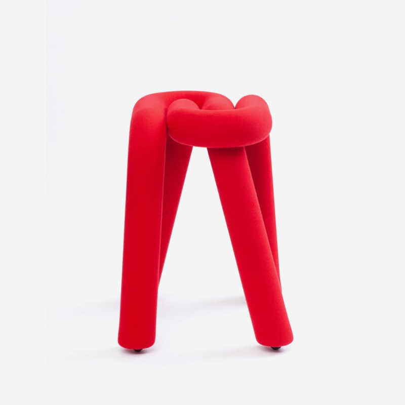 De Bold Stool bestaande uit twee buisvormige delen van metaal die in elkaar vallen, is een vernieuwde versie van de traditionele stoel gemaakt van gebogen stalen buizen. Zacht gemaakt met een laag polyurethaanschuim zit je direct op de dikke buisvorm. Rond het schuim zit een verwijderbare textielomhulsel, die je in de meest sprankelijke kleuren kunt krijgen.